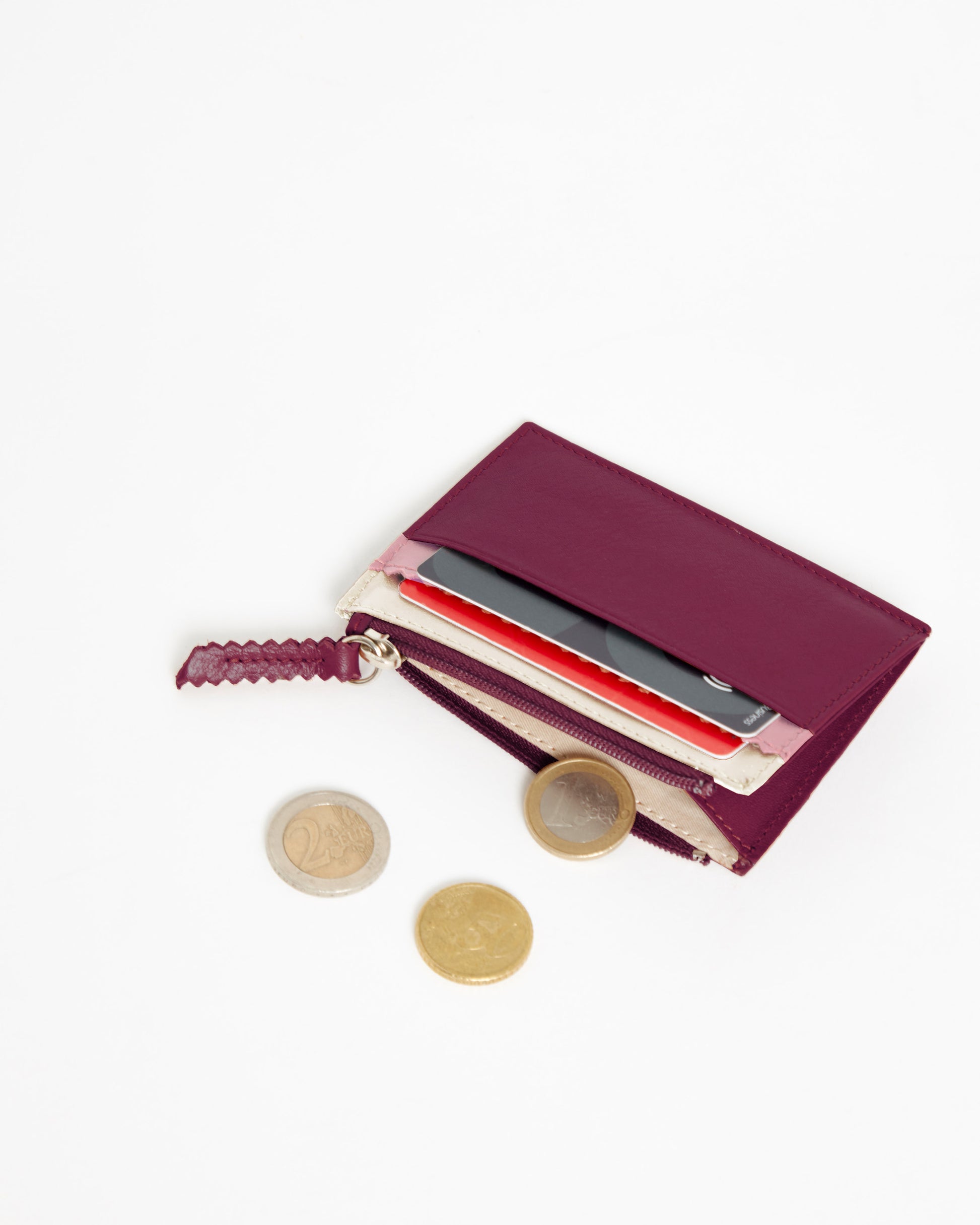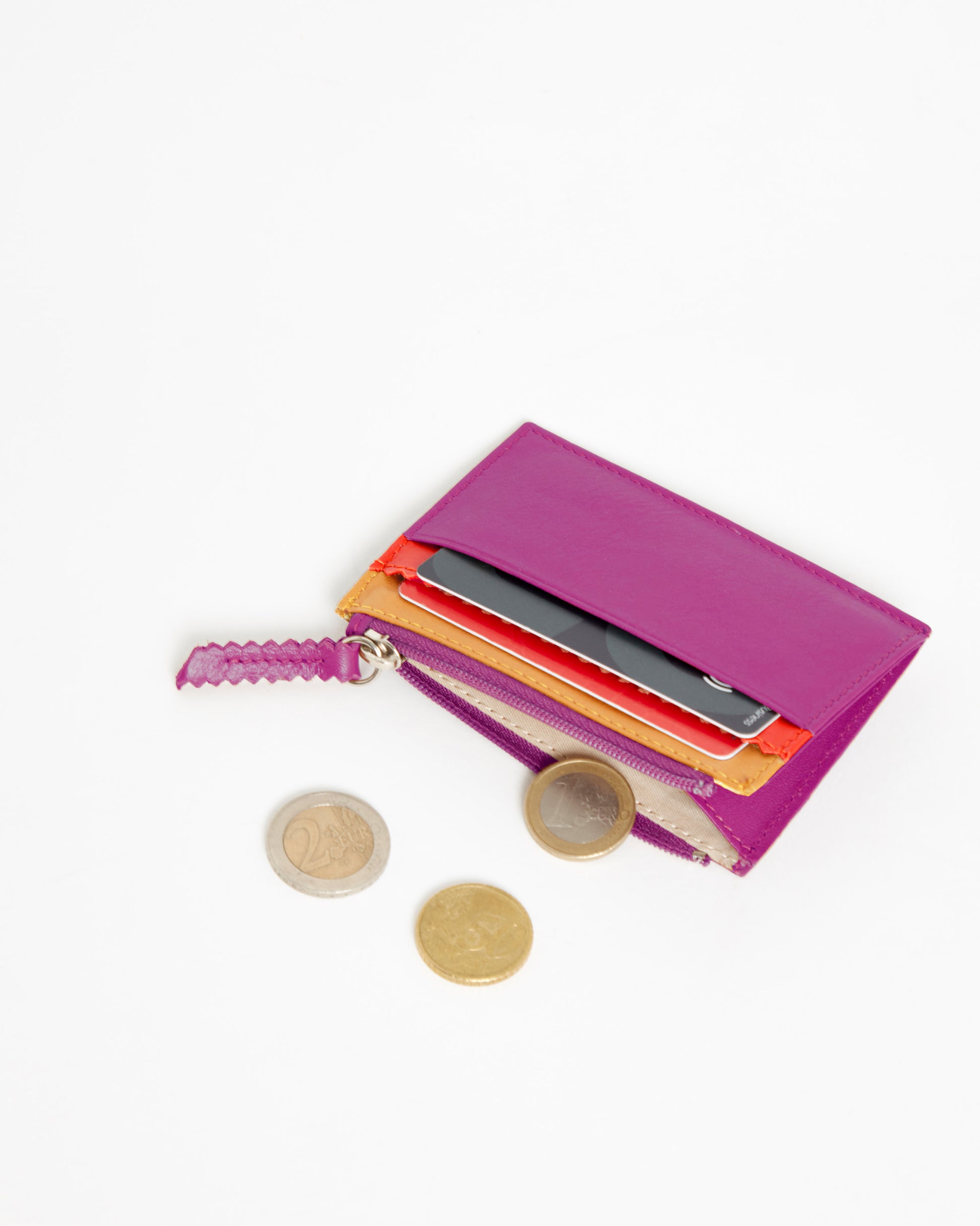 Te caben tarjetas, monedas, algún billete doblado. Una cartera en tamaño mini, perfecta para llevar en bolsos pequeños.
